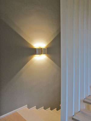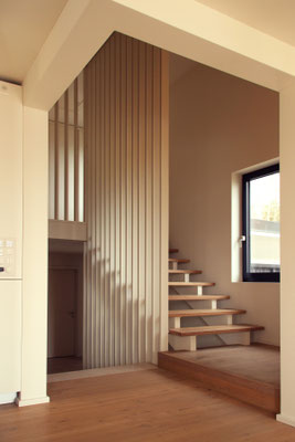Vom grosszügigen Entrée gelangt man über einen Treppenlauf in das Hauptwohngeschoss mit Küche, Ess- und Wohnzimmer, das sich zum weitläufigen Garten öffnet. Zuoberst gelegen sind die privaten Räume, die mit ihrer bergseitigen Ausrichtung die ruhige Atmosphäre des Gartens der Aussicht vorziehen.